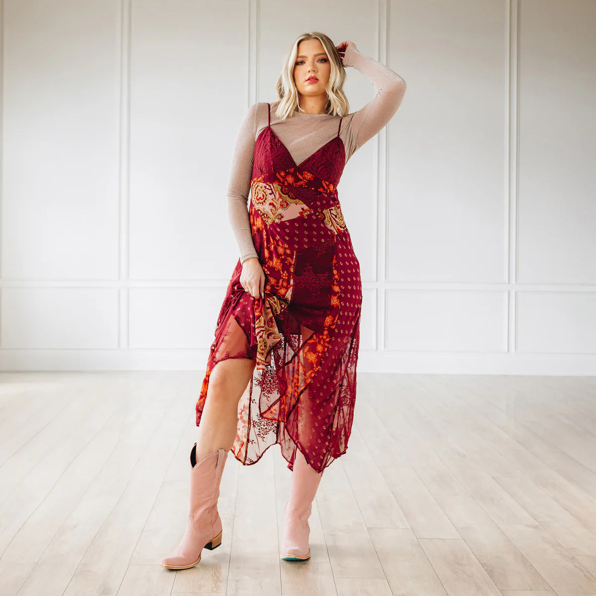 It's giving western. Timeless snip toe and classic cowgirl silhouette. Meet Emma Jane in Blush Pink.